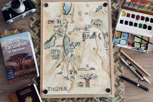 J’ai démarré par notre première étape, Arusha. Ville dans laquelle la vie bat son plein et où tous s’affèrent à travail dès l’aube. Une femme portant des bananes m’attire l’œil par ses couleurs vives et par sa marche rapide. Je la prends en photo aussi vite que possible pour la croquer plus tard. Et voilà mon carnet de voyage de la Tanzanie fait de croquis, d’aquarelles et de matières.
