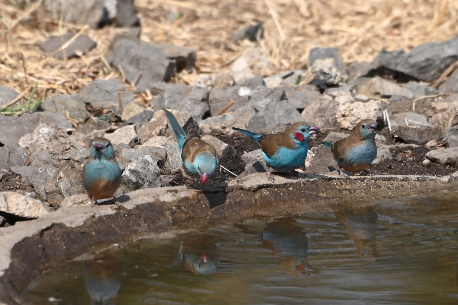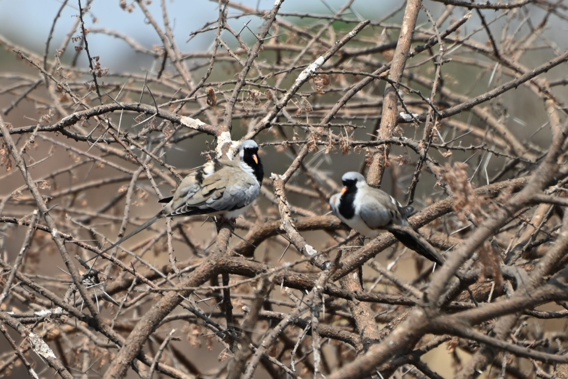 Des tourterelles masquées se reposent sur des branches d’acacia séchées. Cela parait inconfortable et étrange mais les épines de celles-ci protègent les oiseaux des prédateurs, nous précise Joseph.