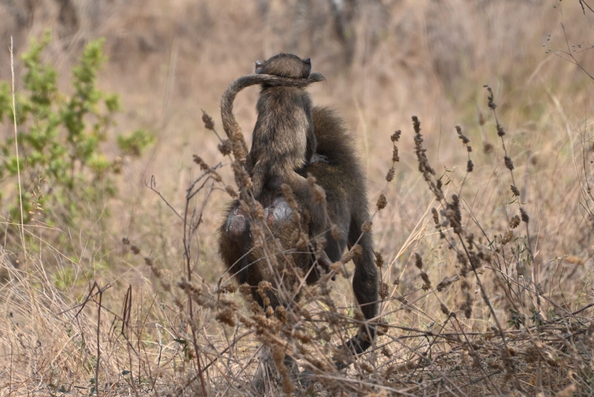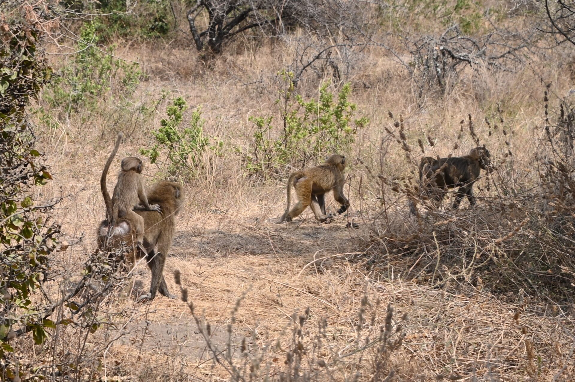 Nous apercevons des babouins de Tanzanie qui déambulent en famille. Une des mamans fait un appui tête à son petit à l’aide de la courbure de sa queue.