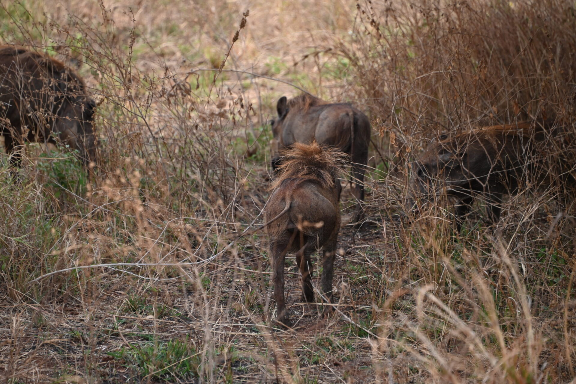 Et Pumba arrive ! Sur le bas côté, une famille de phacochères à la crinière rousse reniflent le sol et s’enfoncent dans les hautes herbes.