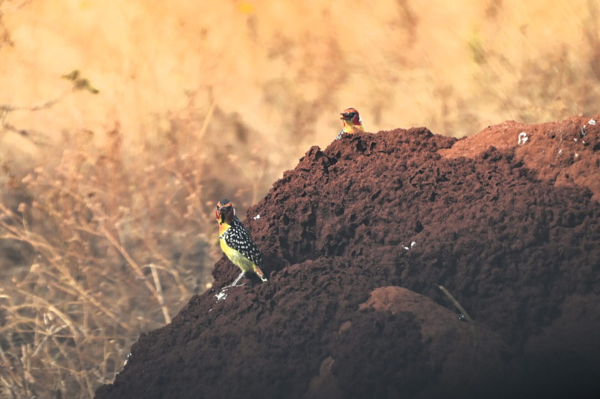 Nous avons eu la chance de voir des barbicans à tête rouge (ventre jaune, tête rouge et dos noir moucheté de blanc) perchés sur une fourmilière.