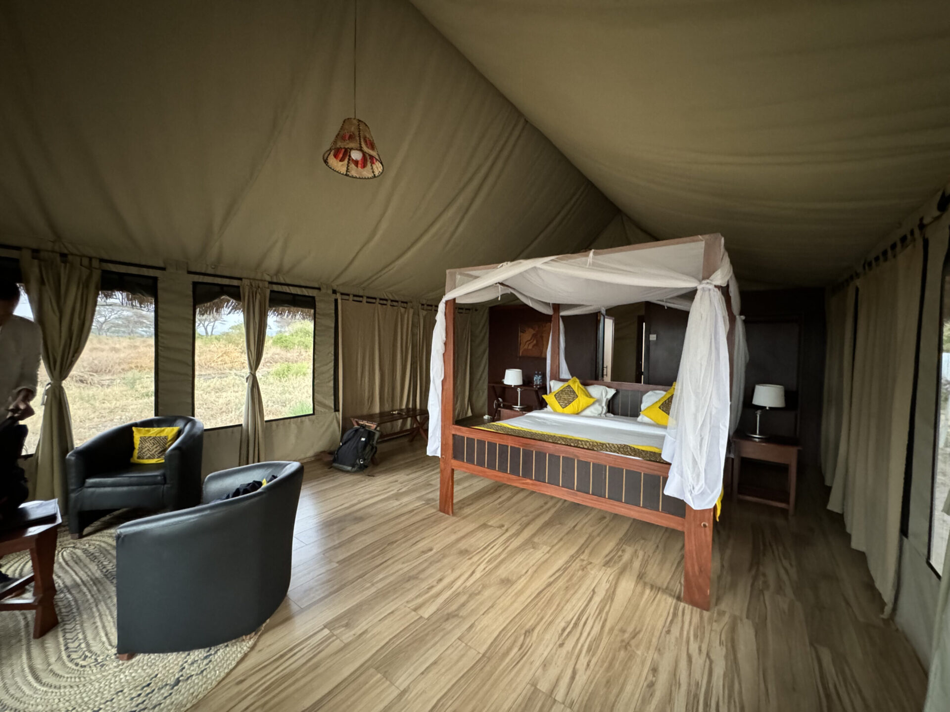 Arrivés au Simba Lodge, au cœur de la nature authentique, des zèbres déambulent entre les tentes. Pour se déplacer, nous sommes escortés par des gardes pour limiter les mauvaises expériences avec les zèbres, les éléphants ou tout autre animal mécontent de tomber sur des visiteurs au sein de son royaume.