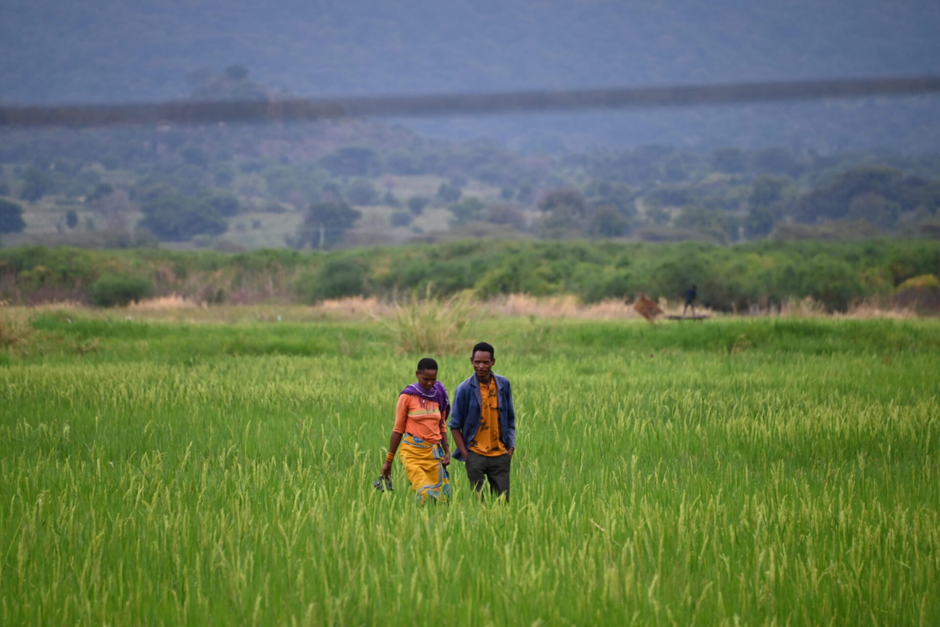 Au pied d’un paysage de collines, que des amoureux empruntent discrètement, Joseph nous explique la maitrise des rizières dans les environs. L’ambiance est calme et embrumée par l’humidité matinale. On aperçoit des « bomas », les habitations typiques des populations agricoles, faites de paille et pour les plus aisés de terre cuite.